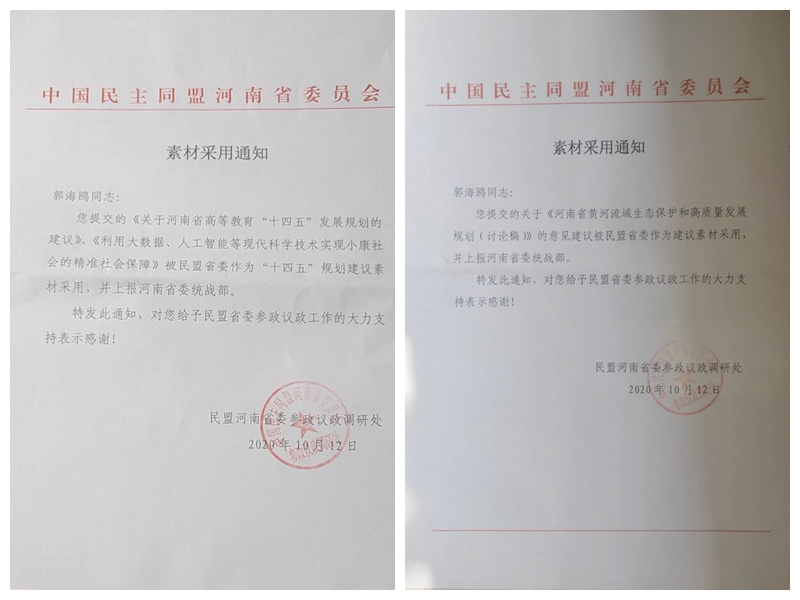 近日,民盟省委下发参政议政素材采用通知,球友会官方网站民盟支部主委、期刊中心副主任郭海鸥副教授的《关于河南省高等教育“十四五”发展规划的建议》、《利用大数据、人工智能等现代科学技术实现小康社会的精准社会保障》两项提案被民盟省委作为“十四五”规划建议素材采用;《河南省黄河流域生态保护和高质量发展规划(讨论稿)》的意见建议被民盟省委作为建议素材采用,3项提案一并上报河南省委统战部。