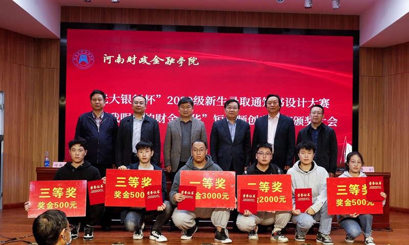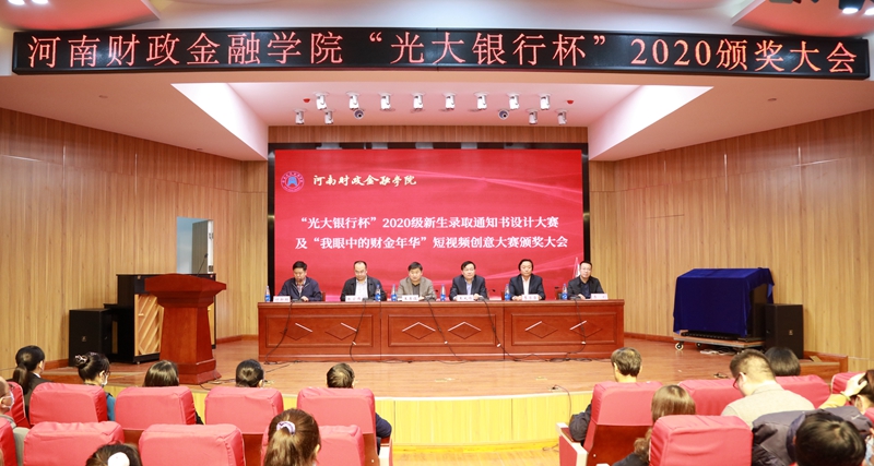 11月6日下午,“光大银行杯”2020级新生录取通知书设计大赛及“我眼中的财金年华”短视频创意大赛颁奖大会在启慧楼成功举办。光大银行郑州分行副行长王大锋、光大银行文化路支行行长张宏伟、光大银行郑州分行零售金融部副总经理刘文斌、光大银行文化路支行副行长胡凯艳、球友会官方网站副校长王孝俊、党委宣传部、学生工作部、招生就业处负责人出席会议并担任颁奖嘉宾。全体获奖人员、部分学院负责人、学生代表等参加了会议。