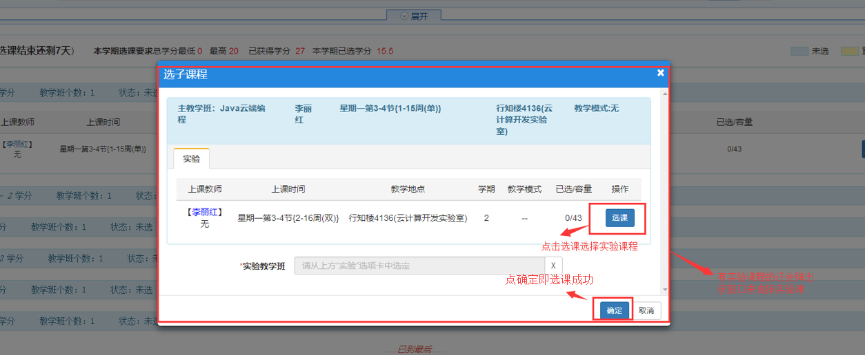 如果所选课程为“独立设置实验课”,则在出现的下图界面中,依次点击“选课”“确定”按钮。