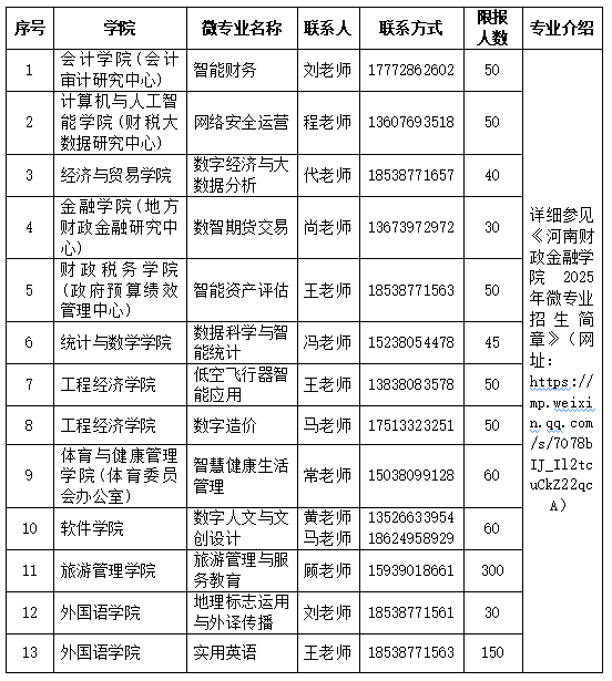 为主动适应新技术、新产业、新业态发展需求,充分发挥学校学科专业优势,满足应用型人才培养需求,提高学生就业竞争力。根据《球友会官方网站微专业管理办法》(豫财院〔2024〕293号)文件要求(附件1),结合学校实际,现开展2023级和2024级本科专业学生申请修读微专业工作,具体要求通知如下: