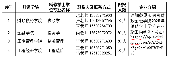 1.成功报名辅修学士学位专业的学生,根据《河南财政金融学院2025年辅修学士学位专业招生简章》(网址:https://mp.weixin.qq.com/s/n5XpNeRgaQotlw0FVGHzHg),需修完辅修学士学位专业培养方案要求的全部课程并达到毕业要求。