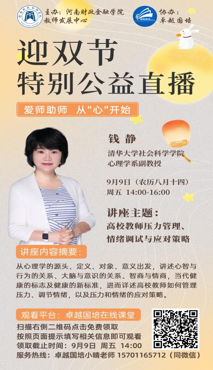 又是一年开学季。为了使教师们克服长假之后开学带来的不适和压力,快速顺利地切换到课堂教学模式,由教师发展中心主办,卓越国培协办的“迎双节特别公益直播——“爱师助教,从心开始”活动,将于2022年9月9日进行,名额有限,先到先得,直播暂支持7天回放。具体安排如下图:
