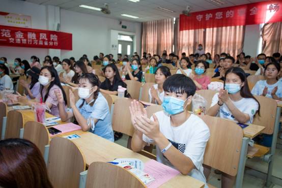 讲座开始之前,学校工作人员、交通银行和财付通科技有限公司职工一起向参与活动的师生分发活动宣传册,讲解相关防骗、反诈知识。