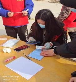 20级大数据1班朱梦露同学,主动到村委会报名参加志愿者队伍,在安阳市文峰区宝莲寺镇参与核酸检测信息录入、配合医护人员进行入户检测、在村口卡点进行值守登记等。