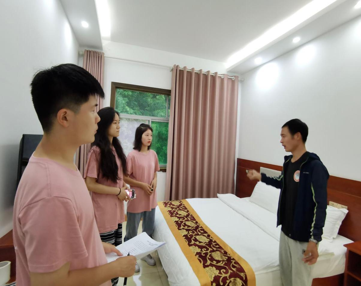 深入景区酒店,广泛开展大走访大调研。为提高学生深入基层、贴近事实的意识,提升收集信息、发现问题、分析研究问题的能力,帮助当地旅游、酒店行业破解难题、提质增效、创新发展,助力乡村振兴,将实践团队分成6个调研小组,通过入户走访、分发问卷、面对面交流等方式,围绕景区酒店产业发展问题开展大走访大调研活动。实践队员们不怕劳累、不惧雨淋、不畏拒绝,对天池山景区18家酒店(宾馆、民宿)进行了实地走访,共发放调查问卷115份,调查500多人,通过走访大调研,实践队员们获得了大量、真实有效的一手资料,激发了助力乡村振兴的科研兴趣,提升了收集信息、发现问题、分析问题、解决问题的能力。