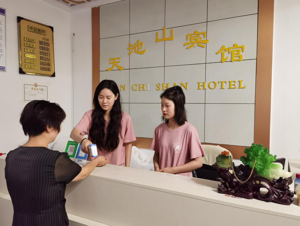 深入业务一线,真实体验酒店经营管理。作为学院实践教学合作单位,天池山宾馆是当地经营较为成功的酒店之一,学院特邀请总经理白一好担任实践教学指导老师,一对一、手把手为同学们进行现场教学。教学内容包括文化塑造、服务理念、经营态度、运营方式、沟通协调、业务技能等多个方面,实践队员们认真学习,真切体验,实战操练、收获满满。